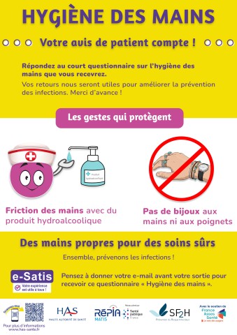 Une enquête est mise à disposition des patients sous la forme d’un court questionnaire, leur offrant la possibilité de donner leur avis sur l’hygiène des mains afin de renforcer la prévention des infections. Une affiche sera installée dans l’établissement pour leur permettre de scanner le QR code.